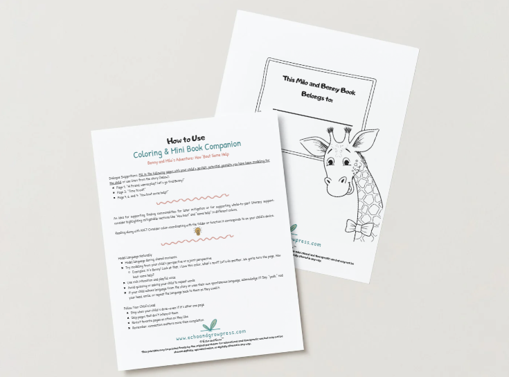 Thank you for your purchase of “How Bout Some Help?" We hope you enjoyed your “everyday” adventure with Benny and Milo. Take your child/student on their own adventure with our Mini Coloring Book. Each child and their language is unique! Customize this “How Bout Some Help?” companion.